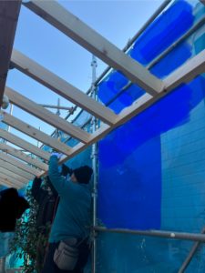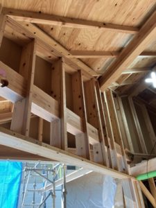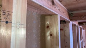 断熱は柱内面平らになるように入れていくし、気密シートも貼って行くので、気密シートをやってからだとヒラヒラしていて、上手く墨が打てない。