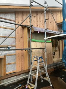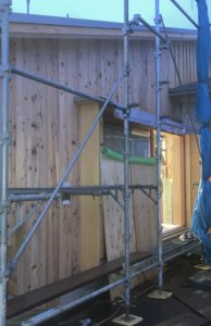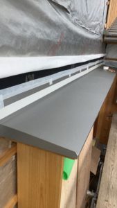 庇板金の立ち上げにも念のため防水テープを貼っておきます。透湿防水シートを被せて、下地をやって板貼りの続きをやっていきます。
