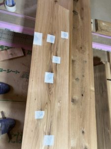 今回、節の抜けがあるんで、スティックパテで埋めるんですが、あとで抜け落ちそうな節裏に、試しに防水気密テープを貼っておきました^_^