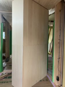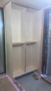 下駄箱も直角と内寸を見ながら、裏板のシナベニヤを貼って、