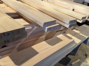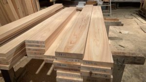 木の目や白太、赤みのバランス、窓枠なんで1箇所縦横2枚づつ。だいたい同じ様な木の目と色を見定めて、木口に使う箇所と厚みを書いておきます。