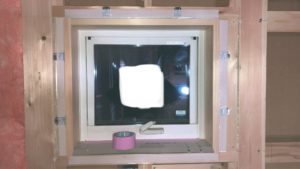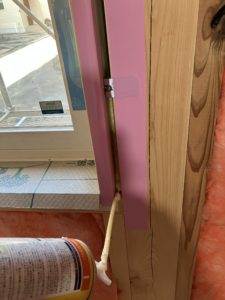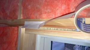 こんな感じで4方向。これでサッシ廻りの気密処理終了。手間はかかりますが、この作業は手間をかけるところ。