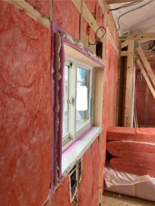 窓枠に少し掛けてあとは壁下地に。L型に貼り付けていきます。この時にシワシワにならないようにやっていきます。きちんとピタ〜っと貼り付けることが重要。気密なんで^_^