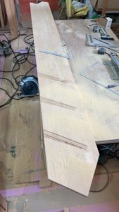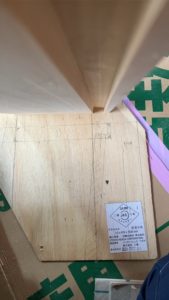 今回は両方とも斜めに割いて加工。蹴込板を差し込む溝も斜めにシャクリ。