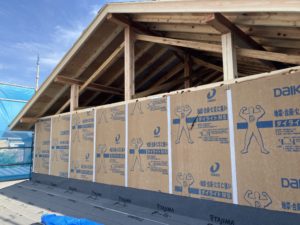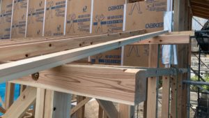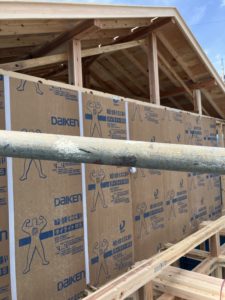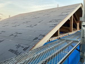 まずは耐力面材から。そしたら垂木掛け。この時に両端のコーナー部分には透湿防水シートを挟んでおきます。