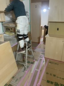 床養生剥がしが主な目的。手摺を再取り付けしたり火災報知器や物干し金物等、細かな取り付け工事も加えてやってました。